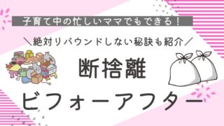 収納・整理子育て中の断捨離ビフォーアフター!絶対リバウンドしない2つの秘訣 「子育て中は余裕なさ過ぎて断捨離なんて無理!!」…と思いながらも断捨離成功した、我が家のビフォーアフター写真を紹介します!!整理収納アドバイザー歴2年の私が、絶対にリバウンドしない2つの断捨離とお片付けの秘訣も伝授いたします♪秘訣その①断捨... 2025.10.24 2025.11.14収納・整理